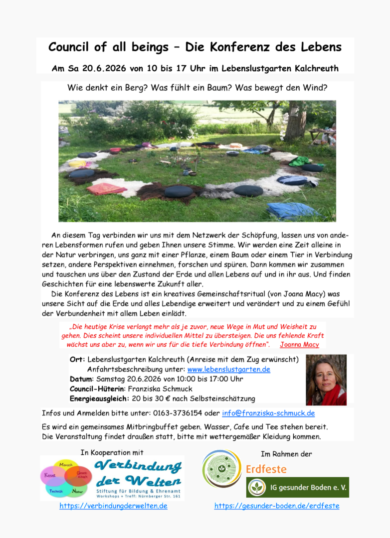 Ein liebevoll gehaltener Forschungsraum (für Musiker und noch nicht Musiker), eine innere Medizinwanderung mit deiner Stimme, eine neue Begegnung mit deinem Instrument. Wir treffen uns unterm Walnussbaum im Lebenslustgarten, inspiriert vom Vogelzwitschern, dem Rauschen des Windes, der Verbindung zur Erde. Wir wollen lauschen und staunen, was nach einer kleinen Einstimmung entstehen möchte, alleine und gemeinsam. Eingeladen sind auch gerade die Menschen, die vielleicht im stillen Kämmerlein Musik machen und gern den Mut haben möchten, ihren Song in einen größeren Raum zu gießen. Oder auch Menschen, die gern mehr Zugang zu ihrer Stimme und ihrer eigenen Musik finden möchten. Bist du neugierig, dann komme gern vorbei.