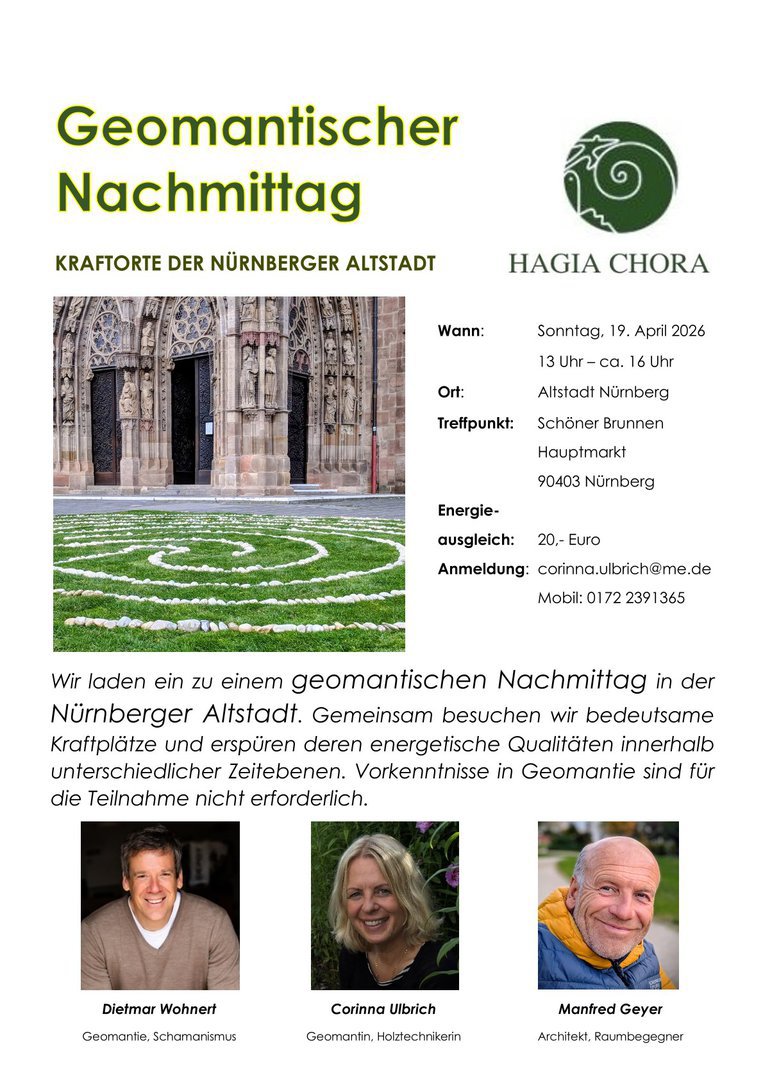 Die Geomantie bedient sich verschiedenster Werkzeuge um verborgene Schichten der Natur zu erfahren und auszudrücken. Es geht darum, die Seele der Erde und ihrer Wesen zu spüren, die Weite des Kosmos aufzunehmen und sich in Resonanz damit zu entfalten. Außerdem ist die äußere Natur auch immer Spiegel unserer inneren Natur, so dass wir auf geistig-seelischer Ebene bereichert und berührt werden. Wir lernen geomantische Praktiken kennen, vermitteln einen Einstieg in die Welt der Geomantie und eröffnen einen Zugang zu eigenen Erfahrungen. So wird die Kommunikation mit den mehrdimensionalen Räumen geübt und die Beziehung zu Gaia und damit deinem eigenen Sein vertieft.